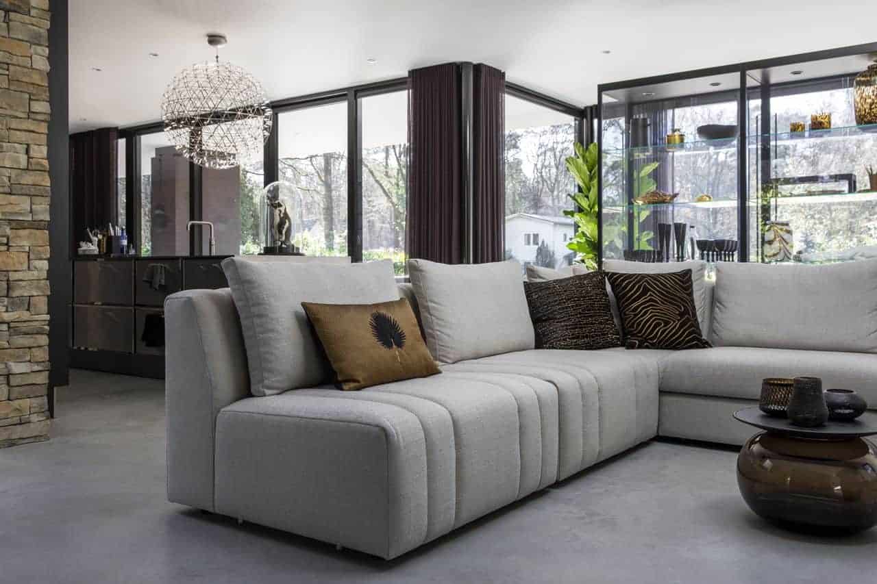 Bij de betonvloer in deze woonkamer is gekozen voor een diepe en donkere grijstint. De combinatie met houtsoorten en donkerbruin geven de woonkamer een heel warme uitstraling. Zachte materialen en donkere kleuren die goed uitkomen door de prachtige lichtinval.