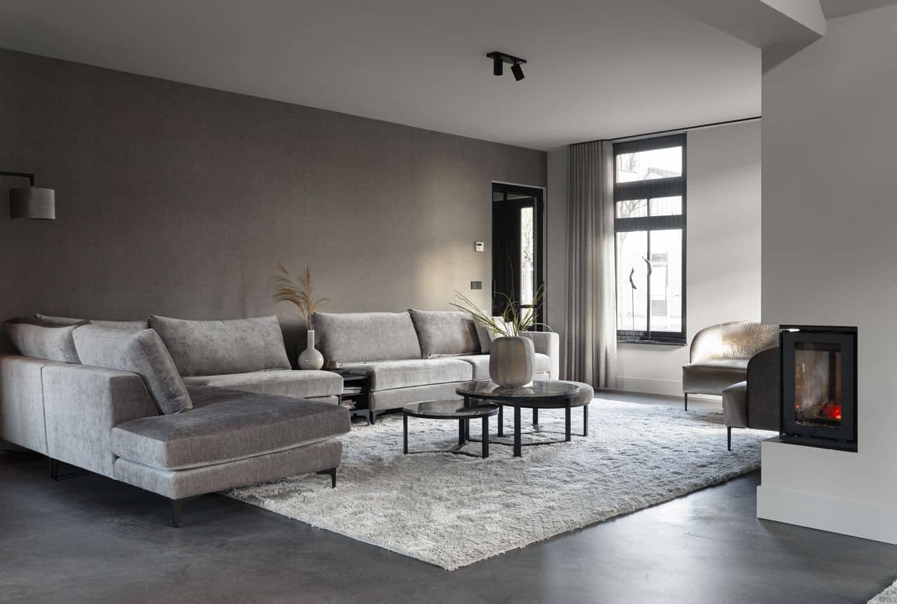 Hieronder zie je de combinatie met een sfeerhaard en de toevoeging van een zacht vloerkleed. Ook deze vrijstaande woning heeft moderne elementen, maar hier is de vloer niet meer weg te denken uit dit landelijke interieur.