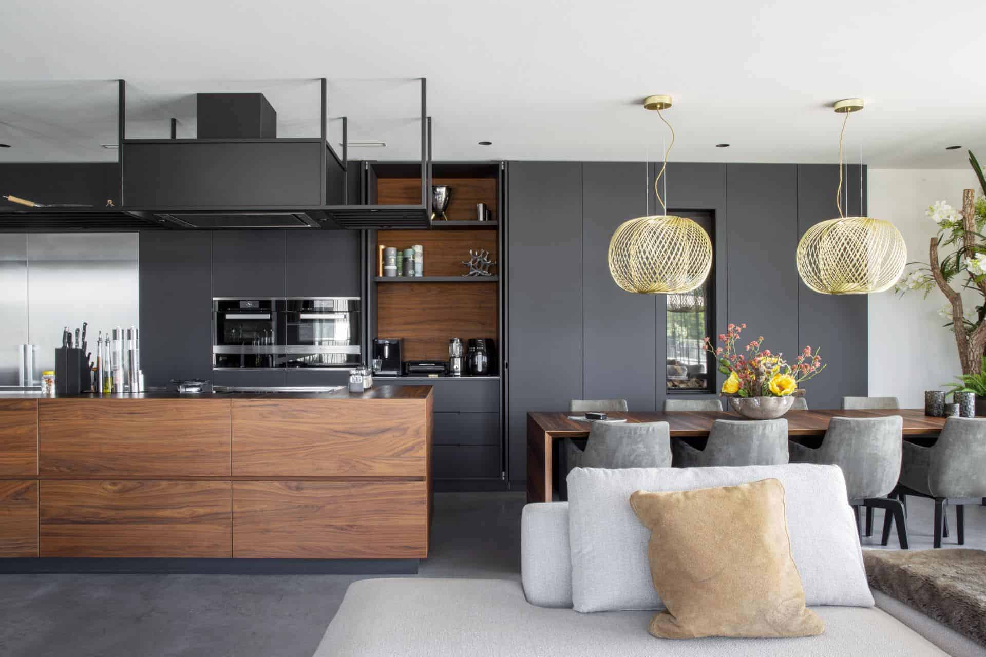 Gevlinderde betonvloer in Den Haag. Deze ligt in de keuken. De keuken is bruin en er staat een kookeiland met 5 barkrukken. De tafel is van hout met daaraan een houten bankje en vier stoelen.